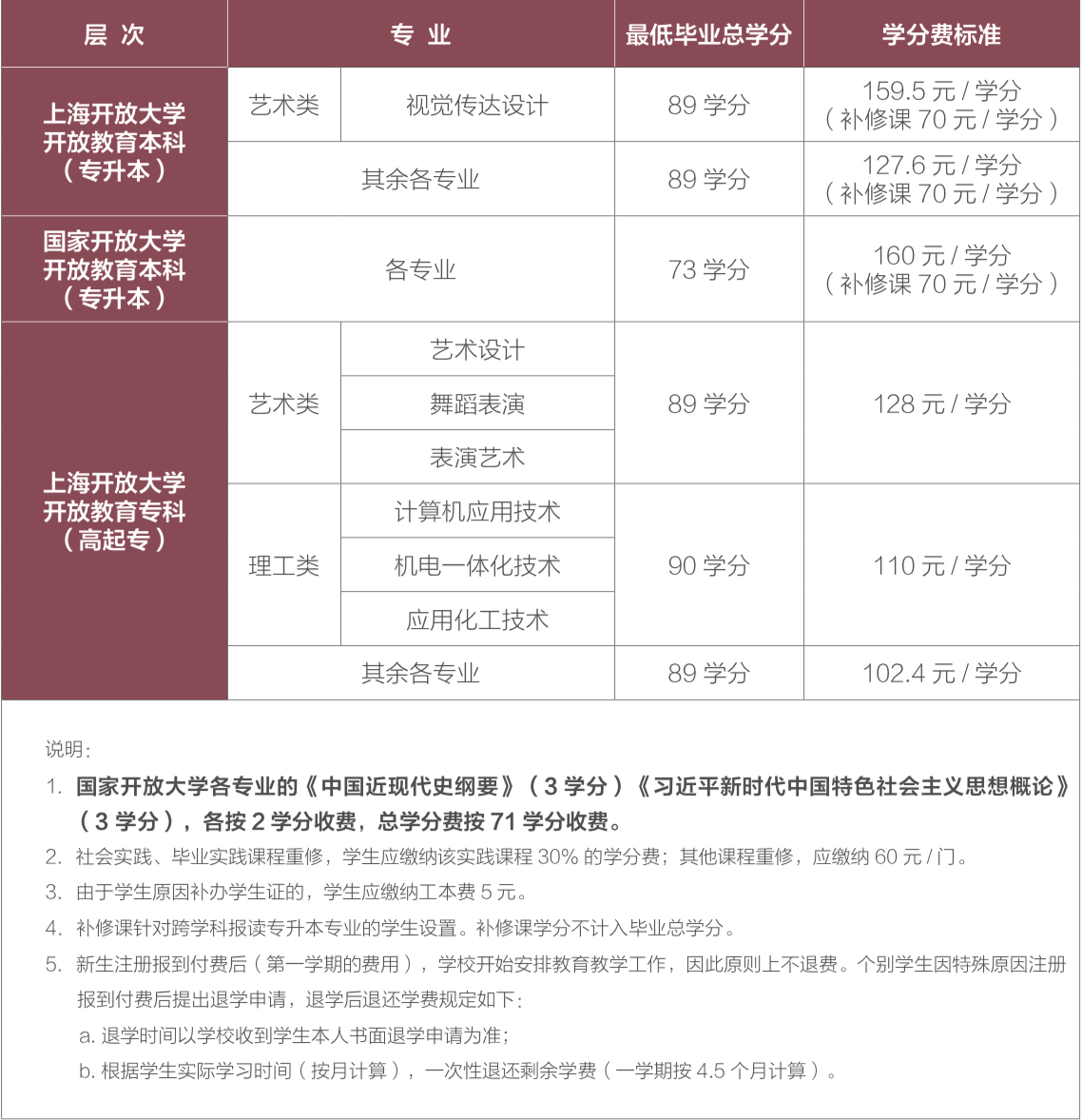 上海开放大学实行学分制管理,每学期按学分收费,请勿转账给个人。如按5个学期计算,平均每学期只需支付2000多元学费。具体标准如下: